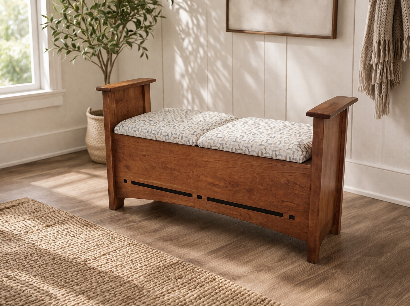 This Amish-crafted storage bench with cushion combines everyday comfort with practical design. Built from solid wood, it features a sturdy frame paired with a comfortable upholstered seat, making it a perfect addition to entryways, bedrooms, or living spaces.