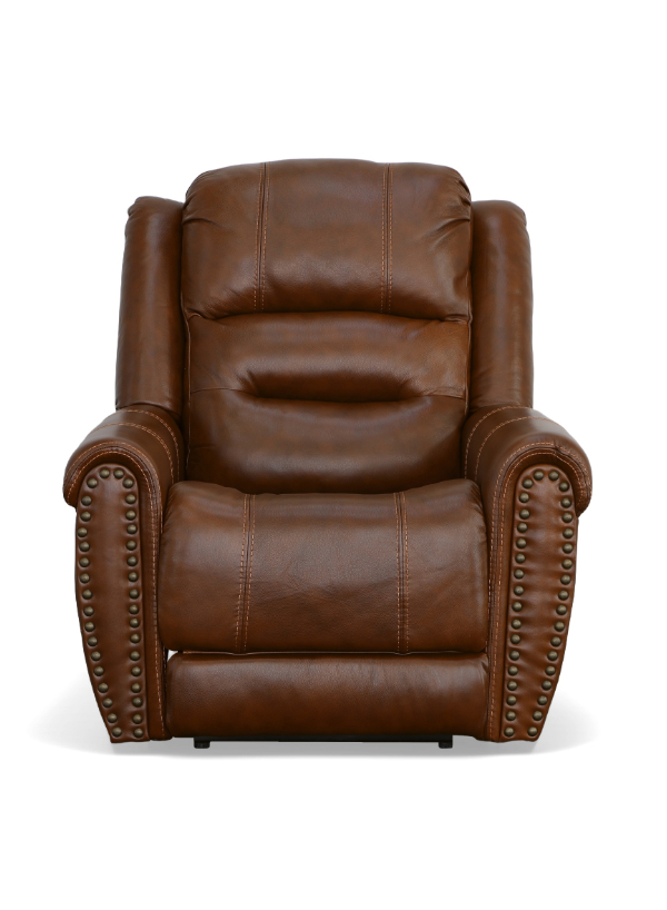 The Flexsteel Oscar Power Recliner combines traditional design elements with modern functionality to provide exceptional comfort and style. Upholstered in rich grizzly brown leather, this recliner features nailhead-trimmed rolled arms and heavy-thread stitching, enhancing its classic appeal. The power reclining mechanism allows for effortless adjustment from an upright to a fully reclined position, while the power headrest offers customizable support for your head and neck. The extended footrest provides additional leg support, accommodating users of varying heights. Built with Flexsteel’s patented Blue Steel Spring™ seat system, the Oscar recliner ensures lasting durability and support. A right-hand side storage pocket offers convenient space for the hand wand control and other personal items.