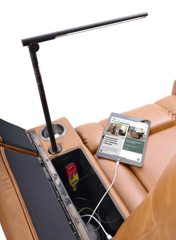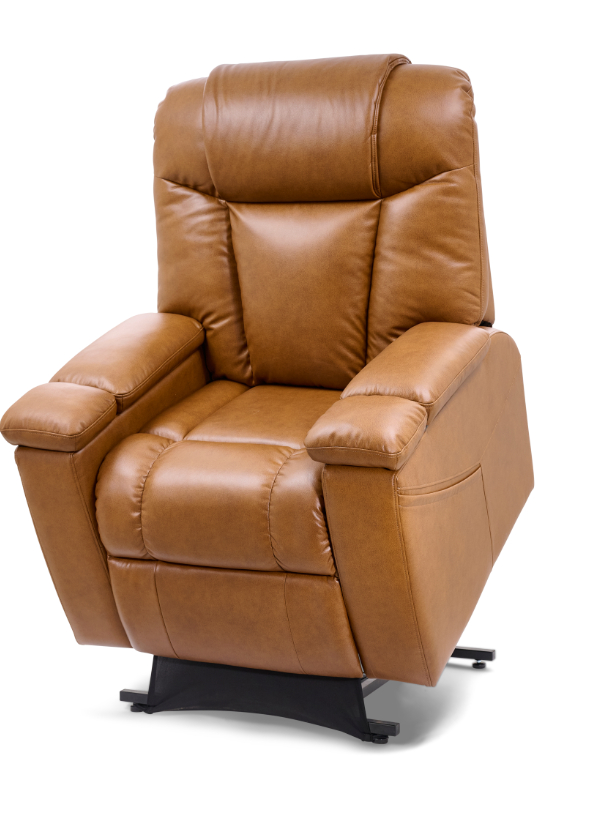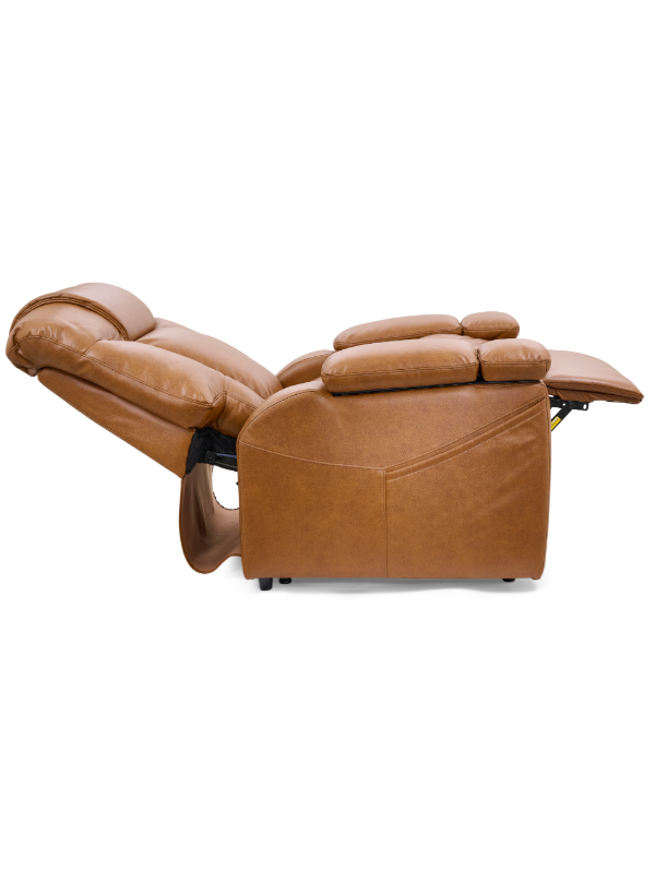 The UltraComfort Rhodes Recliner (UC-472) is a medium-sized power lift recliner designed for ultimate relaxation and convenience. It features an overstuffed seam back, plush chaise pad, and an open arm design with hinged panels that reveal built-in cup holders and storage compartments. The 4-Zone Comfort Zone Positioning System, including patented Stellar Positioning, allows for customizable comfort, all controlled by the programmable AutoDrive™ hand control. Standard HeatWave Technology provides therapeutic warmth from shoulders to feet. Available in Sinda fabrics: Lagoon, Sparrow, and Umber. Dimensions: 37” W x 45” H x 37” D; Seat: 22” W x 21” D x 20” H. Weight capacity: 375 lbs.